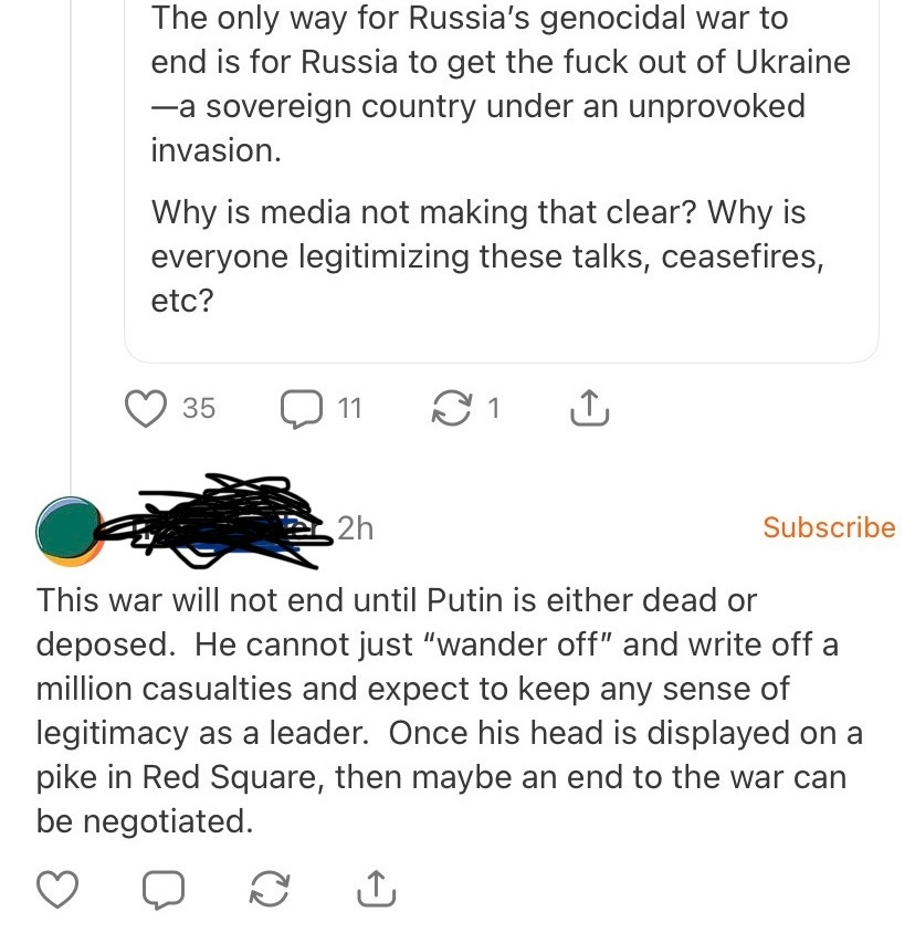 The OP is theatrically angry at the notion that anyone would even think about peace talks; the “only way” for the war to end is for Putin to leave Ukraine immediately, in toto. When I pointed out that there is no force available to compel Putin to leave, meaning that he will either have to be persuaded to do so or magically just develop a case of ADD and meander off towards something more interesting, the below commenter responded by doubling down. For him, the only way the war will end is if Putin is dead.