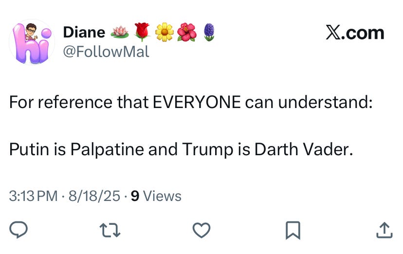 The good news is you still have time to avoid being a Putin ball-licker and enlist in the Ukrainian Army while there are plenty of Dark Side Nazi Dalek Death-Eater Russians to kill. The bad news is that that window may be closing fast. President Trump, animated by his businessman’s trust in deals, his vanity, and apparently his genuine awareness of his own mortality, is seeking peace. Some people doubt the prospects; I’m hopeful.