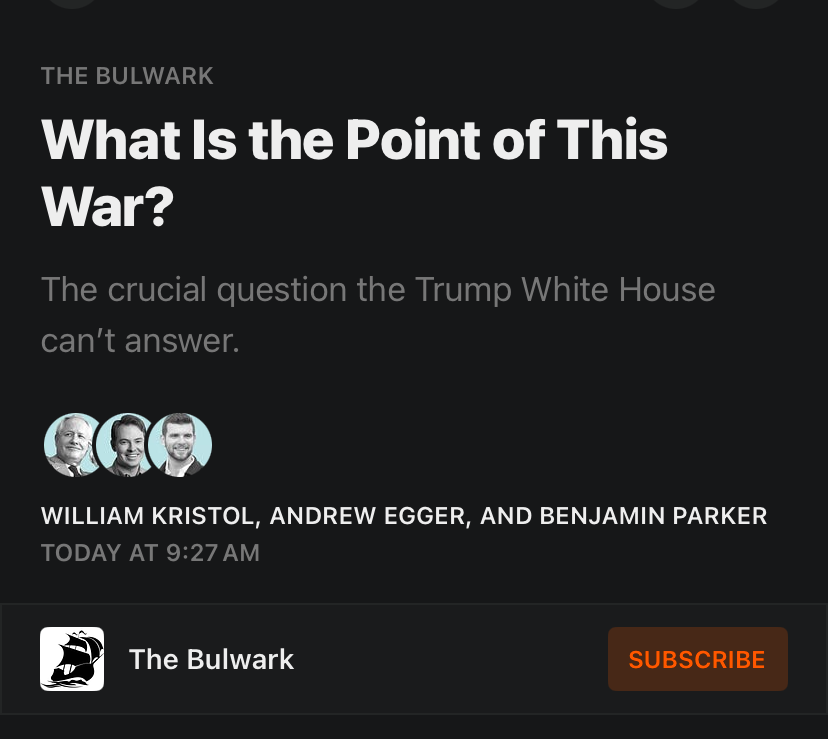 Now, the crew at The Bulwark has been voting for this war since the 90s, right up until Trump launched it, at which point they began denouncing it.