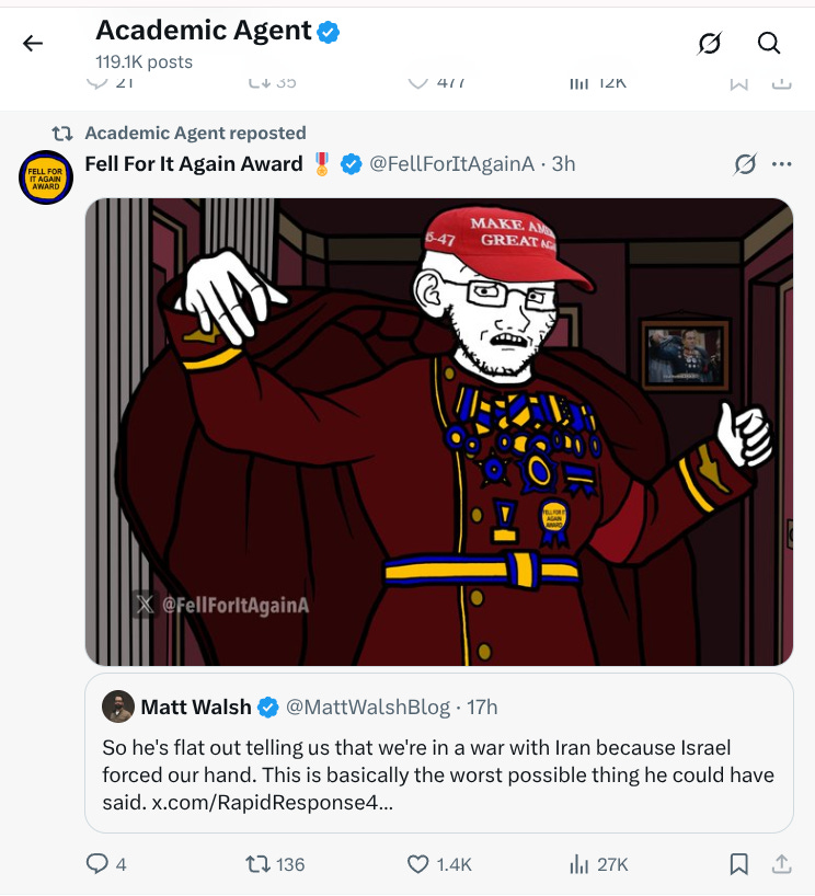But that’s us. It’s easy to forget that the true right is first of all relatively young and secondly very online, and that a large segment of Trump’s electoral coalition are neither. I mention seemingly tone-deaf framing because, while the notion of doing the whole Schwarzenegger-Weathers hand-holding meme with Israel plays very poorly with those of us on X and Substack, the NormieCon Boomers who are just as major a part of his constituency absolutely love hearing that narrative as they listen to OAN while they read about it in the local newspaper. Israel and Iran mean very different things to that generation than those that came after; the former conceived of as the plucky nation that brought freedom and democracy to the Middle East after their own Greatest Generation dads stopped Hitler from holocausting everyone, the latter being the land of bearded nutjobs who inexplicably hate America and humiliated it at the tail end of the decade of disgrace that formed the period of the Boomers’ mature adulthood. They like Israel and tend to support it and they hate Iran and tend to want it bombed. Matt Walsh might not like it, and I might not like it, but unless the ongoing war interferes with this year’s Jimmy Buffett Ultimate Margaritaville Red Sea Cruise, it’s going to play well in The Villages.